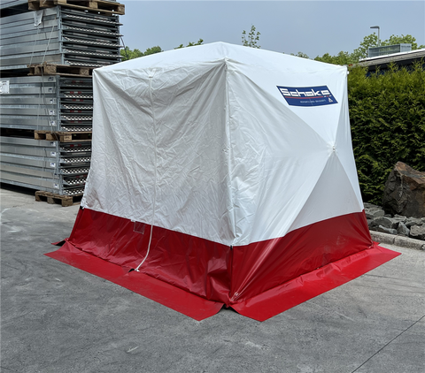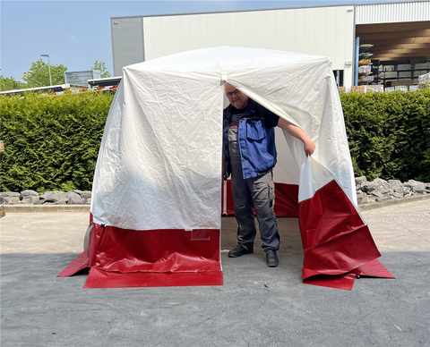 Teltet kan settes opp og tas ned på sekunder. Gir værbeskyttelse for alt utendørs arbeid.